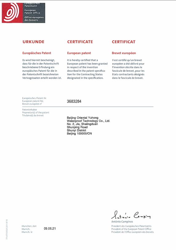 近日,東方雨虹獲得由歐洲專利局(EPO)頒發(fā)的歐洲發(fā)明專利授權(quán)證書(專利號EP3683284)。該專利是東方雨虹HDPE產(chǎn)品研發(fā)過程中產(chǎn)生的核心成果之一。